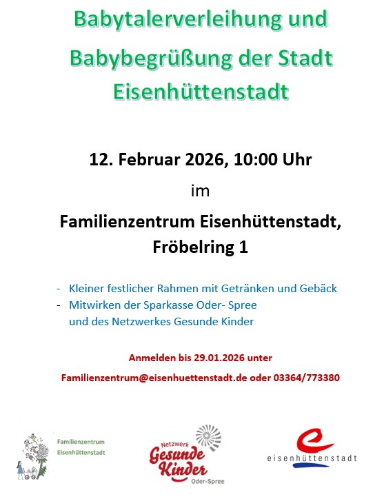 Der Babybegrüßungsdienst heißt Familien mit Neugeborenen ab 2026 herzlich willkommen 💝 Was steckt dahinter? 💛Mehr als ein Geschenk: Ihr erhaltet Informationen, Orientierung und ein offenes Ohr für euren Start als Familie. 🎁Mit im Gepäck unseres freundlichen Begrüßungsteams: ein Präsent für den neuen Erdenbürger. 👍Niedrigschwellig & freiwillig: Der Begrüßungsdienst ist ein Angebot, kein Muss – ihr entscheidet, ob ihr ihn nutzen möchtet. 🤝Gut begleitet: Durchgeführt wird der Babybegrüßungsdienst von uns, eurem Netzwerk Gesunde Kinder Oder-Spree. ✅Interesse am Babybegrüßungsdienst? Ihr könnt Euch entspannt zurücklehnen - ein herzlicher Infobrief flattert nach der Geburt automatisch bei Euch ins Haus💌.
